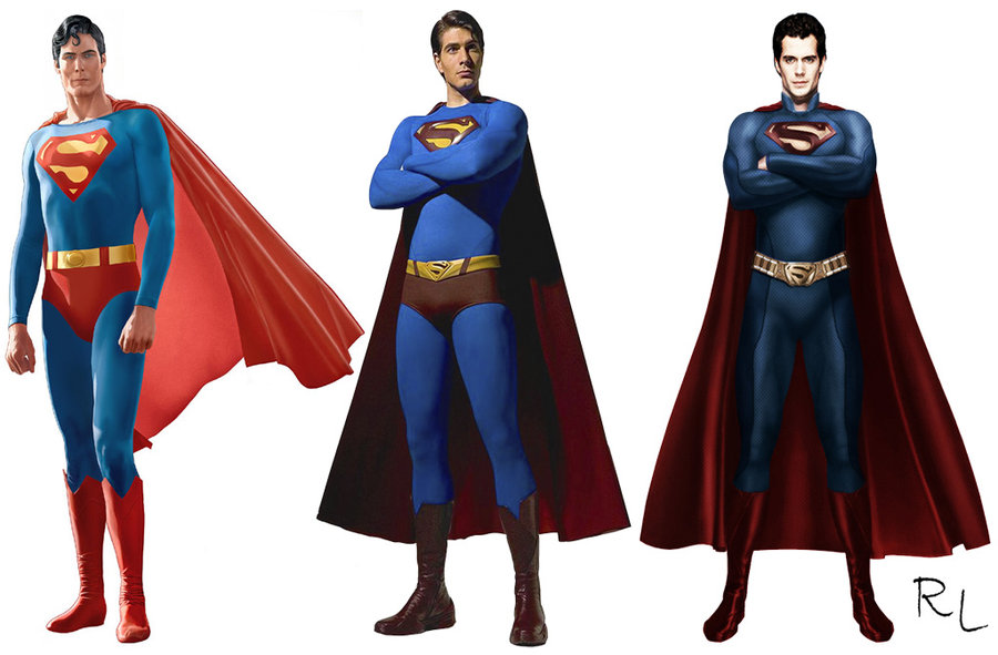 Reeve, Routh e... Cavill? Na internet, um fã brasileiro fez uma montagem comparando os visuais do Superman de Christopher Reeve (1978) e de Brandon Routh (2006) com o que ele imagina que seria o de Henry Cavill. Note que este último segueria a tendência sem sunga.