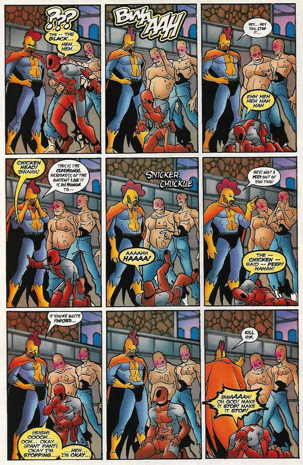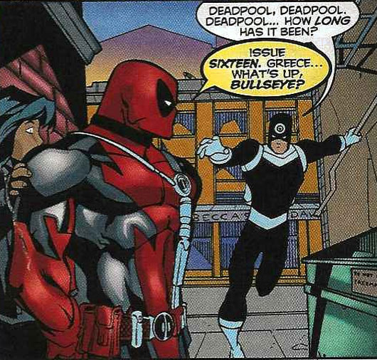 Assim, percebemos que Deadpool sabe que é um personagem de quadrinhos e faz piada com isso. Certa vez, quando encontra o personagem Mercenário (Bullseye), este pergunta “há quanto tempo”, o piadista responde: “na edição 16, na Grécia”.