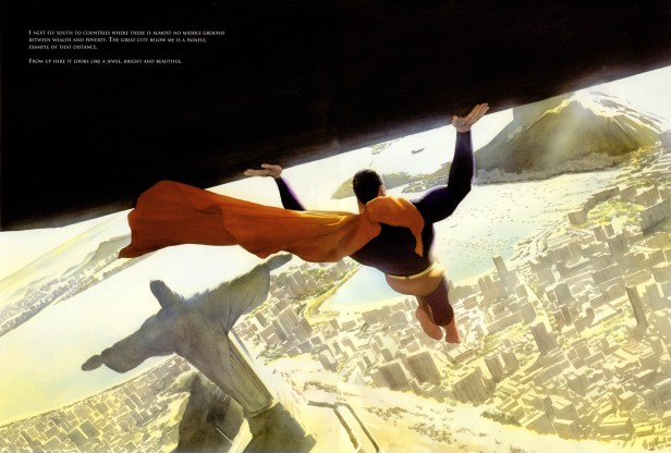 Outra coisa interessante a pensar é que essa premissa combina com duas clássicas histórias modernas do Superman. Primeiramente, com Superman: Paz na Terra, um belíssimo álbum em formato magazine escrito por Paul Dini (roteirista dos desenhos animados Batman – The Animated Series e Liga da Justiça e Liga da Justiça Sem Limites) e pintado (e não desenhado) por Alex Ross. O livro é quase uma introdução ao personagem Superman e o mostra intervindo na batalha contra a fome no mundo e os problemas na África, não deixando de relatar que, muitas vezes, esses poderes de nada adiantam nessas situações.
