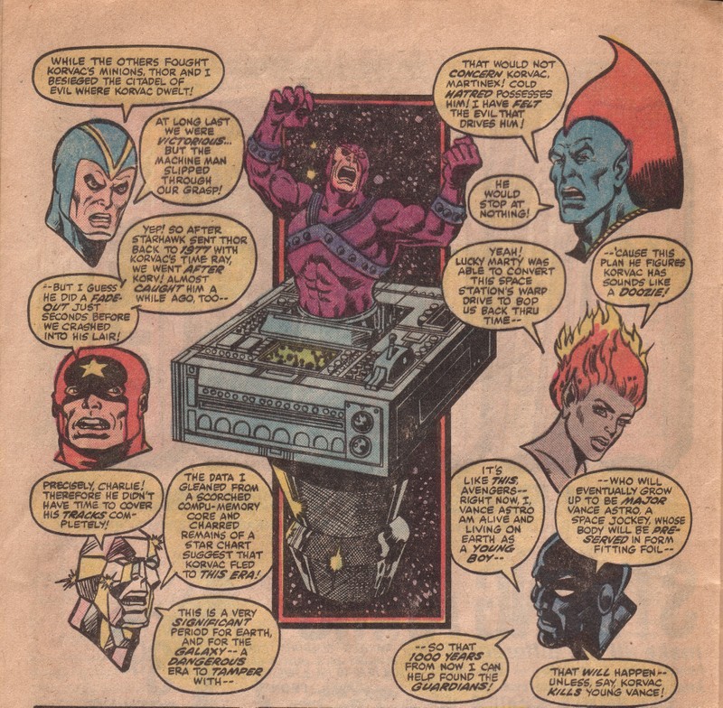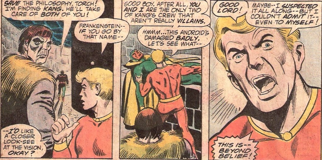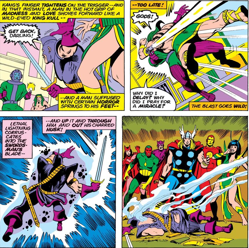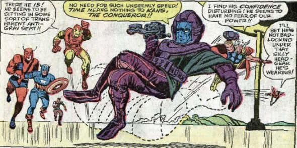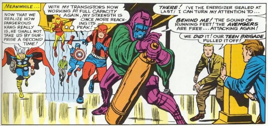 Apenas a ação hábil e coordenada da equipe é capaz de ferir o vilão, com o Gigante usando uma arma especial que derrete os circuitos da roupa-armadura do viajante no tempo. Kang foge e retornaria muitas e muitas vezes, mas esta primeira aventura já o mostrava definitivamente como um de seus maiores inimigos.