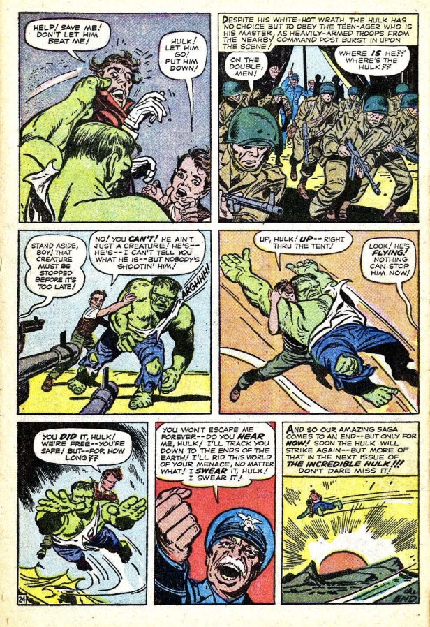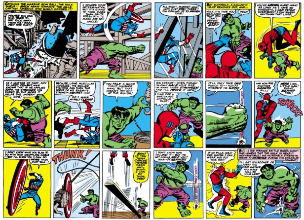 Mas, uma vez que vence o grupo, o gigante de jade segue até a Mansão dos Vingadores e enfrenta o time com o Capitão América em uma batalha colossal lindamente e cinematograficamente ilustrada por Kirby. De novo, a luta fica inconclusa porque o jovem Rick Jones (que era o único que sabia que o monstro era Bruce Banner) joga uma pílula de radiação gama na boca do Hulk, que termina revertendo para o cientista e escapa sem que os outros percebam.