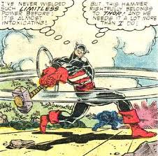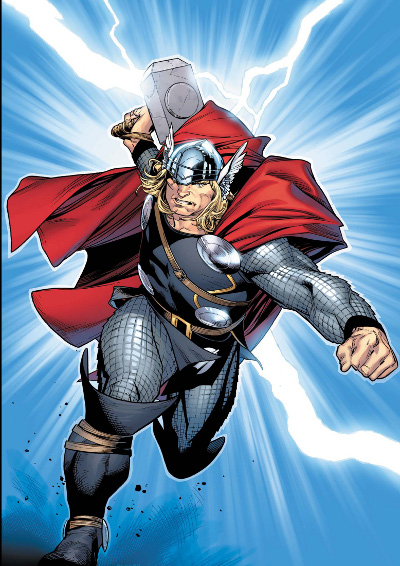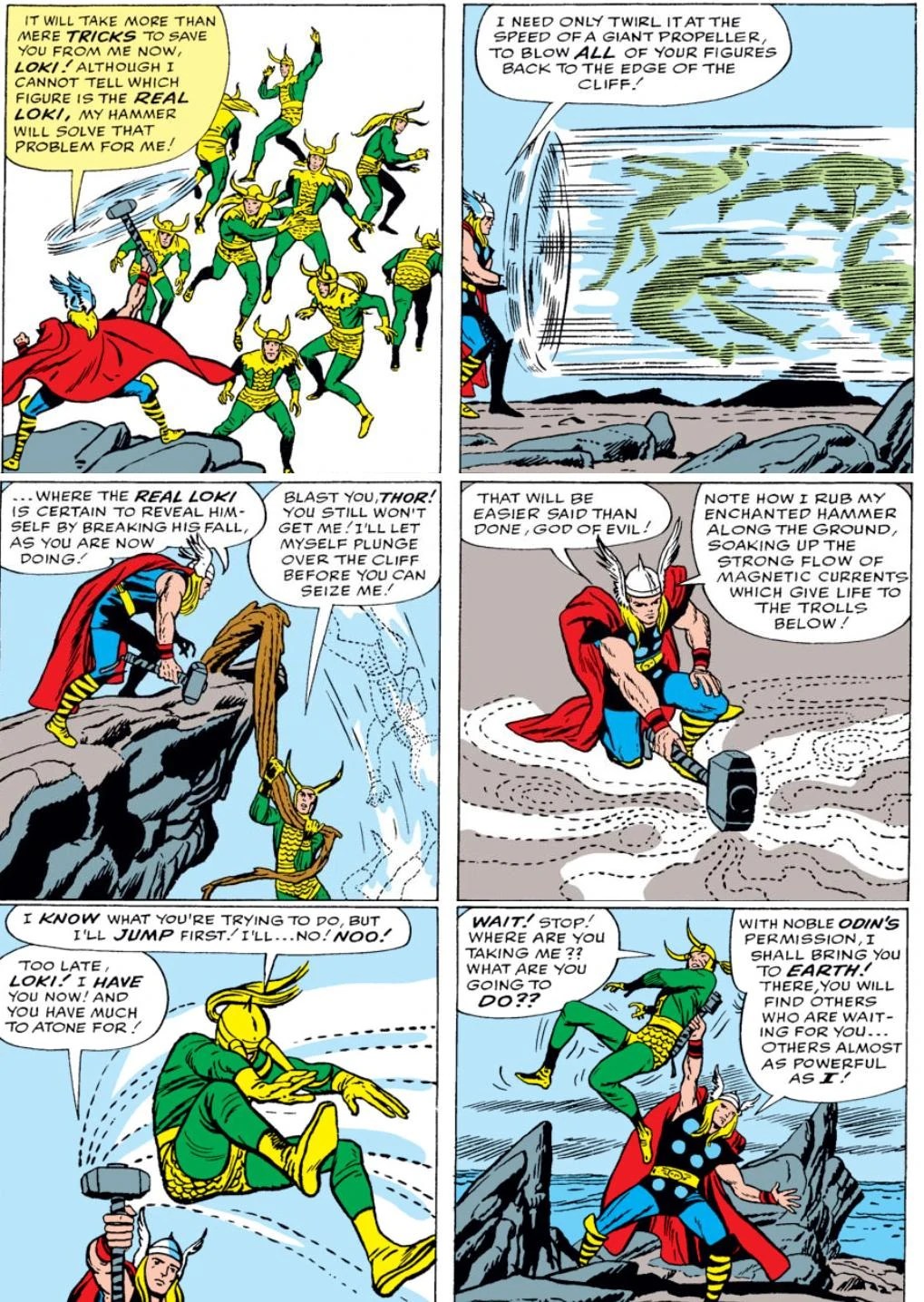 Naquelas tramas, o médico americano Donald Blake é um grande profissional, mas sofre por ser coxo (tem uma perna atrofiada) e usar uma bengala; e numa viagem de férias à Noruega termina testemunhando uma invasão alienígena e, tentando se esconder, encontra em uma caverna o Martelo Mjolnir que traz a inscrição: “aquele que empunhar este martelo, se for digno, receberá o poder de Thor”; e ao pegá-lo, se transforma no Poderoso Thor, o deus do trovão da mitologia nórdica. Nas primeiras aventuras, Lee, Lieber e Kirby mostravam que Blake apenas pensava que tinha herdado os poderes de Thor; porém, na medida em que começou a encontrar outros seres da mítica cidade de Asgard, como seu pai Odin, o meio-irmão e maior vilão Loki, o deus da mentira ou da trapaça etc., termina por perceber que ele é Thor e que a identidade de Blake era apenas um embuste criado por Odin para lhe ensinar uma lição sobre humildade.