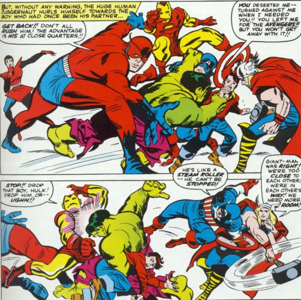 Lee e Kirby não tinham nenhuma pretensão de que os Vingadores fossem uma equipe estável e amigável como os concorrentes da Liga da Justiça. Ao contrário, a tônica do time sempre foi o conflito interno entre seus membros. Afinal, o que aconteceria se reunissem cinco seres superpoderosos em uma mesma sala?