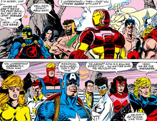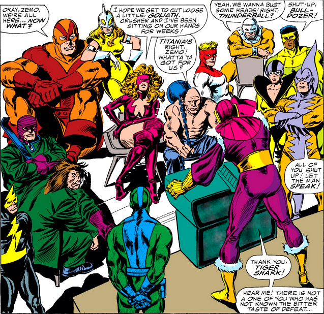 Os antigos membros estavam cansados de tantas batalhas na equipe, enquanto ainda tinham que lidar com suas próprias aventuras solo. Assim, numa reunião sem o Capitão América – que ainda estava tentando retornar da América do Sul após a batalha com Zemo – decidem todos darem um tempo. Mas ao mesmo tempo, o Gavião Arqueiro entra na Mansão e solicita ser integrado ao grupo. Isso dá ao Homem de Ferro a ideia de fazer uma nova formação dos Vingadores. Eles convidam Namor para compor o time, uma forma de fazê-lo abandonar o ódio contra a humanidade, mas o monarca da Atlântida nega. Quem se aproveita da oportunidade quando as notícias de que os Vingadores estão em busca de novos membros é a dupla Mercúrio e Feiticeira Escarlate. Quando o Capitão América finalmente chega, já é incumbido de liderar o novo time, o que aceita relutantemente.