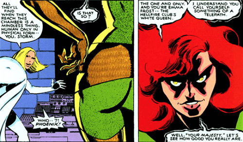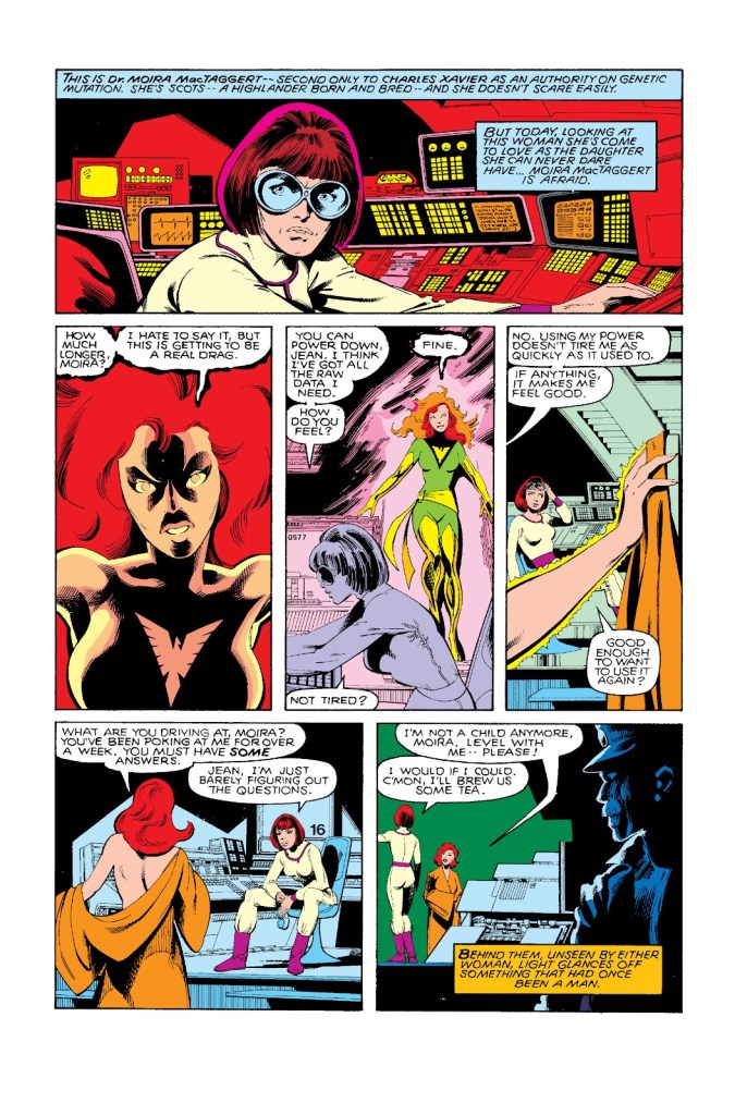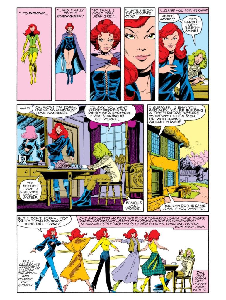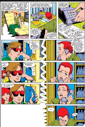O drama de Rachel prossegue pela importante Uncanny X-Men 185, de setembro de 1984, na qual ela está na Mansão X e investiga mais informações sobre o nosso presente. Desesperada, ela liga para seu pai, mas cai em lágrimas ao ouvir sua voz e não diz nada, com ele desligando sem saber o que aconteceu. Rachel ouve a voz de Madelyne e, nas edições seguintes, revela que a voz é igual a de sua mãe… Outra das estranhas coincidências entre Madelyne e Jean que Claremont insistia em dizer que eram apenas fruto do ataque do Mestre Mental… Como era possível?