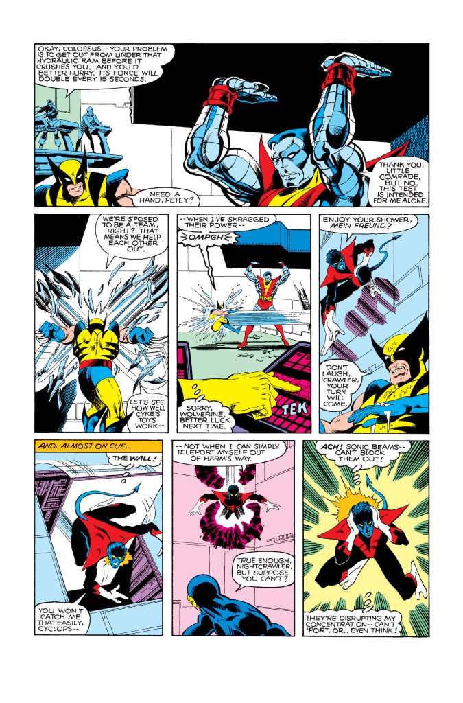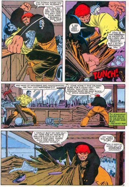 E a edição ainda traz outros dois eventos. Primeiro, Logan e Kurt levam Peter para beber num bar para conversar sobre o término do namoro e lá encontram ninguém menos do que o Fanático, mas em trajes civis como Cain Marko, se divertindo com uma garota lasciva, mas claro, os dois cruzam os caminhos e tem uma “briga de bar” na qual Peter é derrotado. Ao fim, Marko pergunta a Logan se ele quer continuar a briga, e Logan diz que não, que ele não fez nada de errado e deixa o vilão ir embora, pensando que a surra é uma lição para Colossos. A mulher que acompanhava Cain era Selene, uma vilã que é parte do Clube do Inferno, mas eles não sabiam disso.