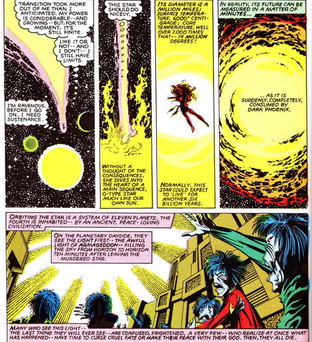 Ao tentarem chamar a ajuda dos Vingadores, veem o Fera ser desintegrado pela tela e os noticiários mostrarem que a ilha de Manhattan foi simplesmente vaporizada pela Fênix! E que os Piratas Espaciais e o Império S’hiar também foram destruídos!