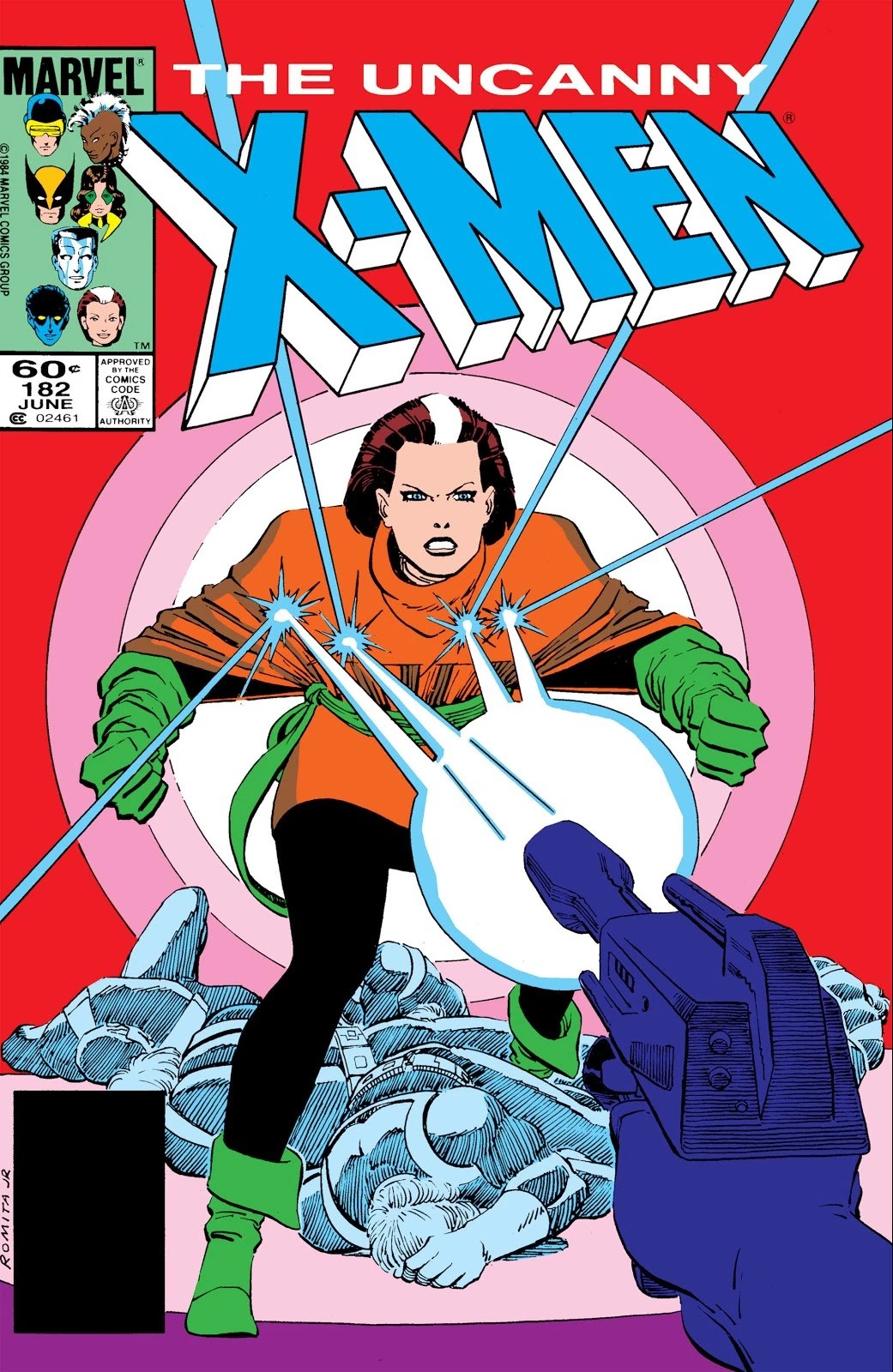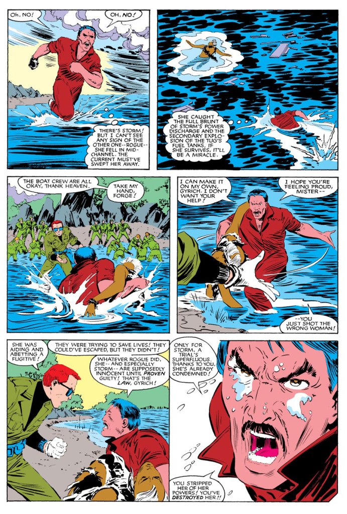 Enquanto isso, Henry Peter Gyrich decide mobilizar as forças armadas numa caça aos X-Men e em particular a Vampira pelo “ataque” à SHIELD, e o próprio Gyrich vai à frente empunhando a arma neutralizadora de Forge! O inventor descobre e vai tentar impedir, pois o artefato não foi testado ainda, e na batalha que se segue, quando Gyrich dispara a arma contra Vampira, Tempestade se entrepõe no caminho e é atingida!!!!