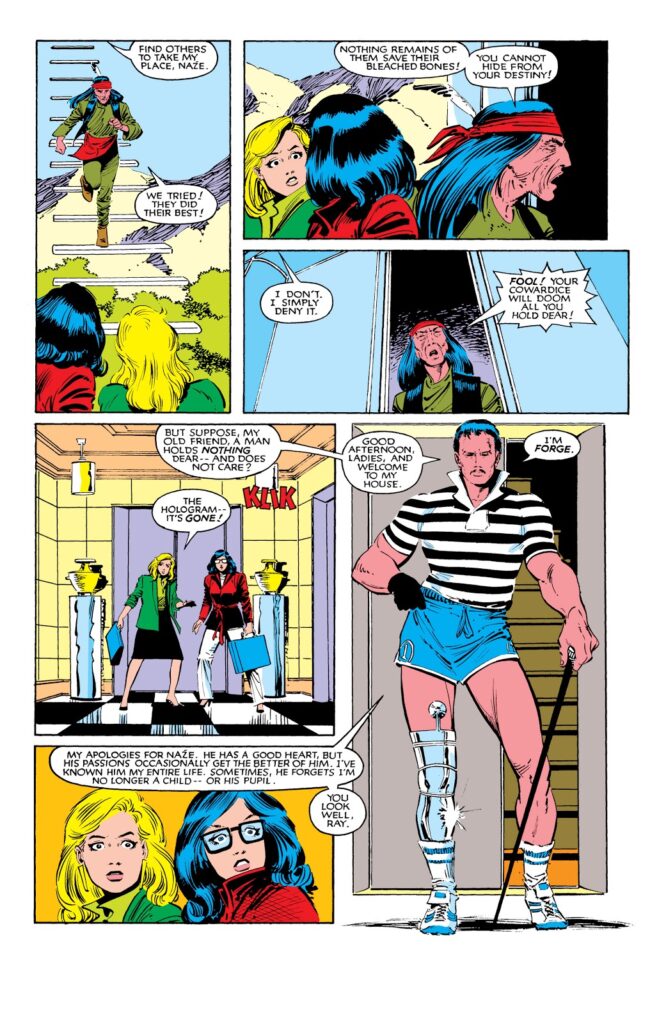 E por fim, vemos Mística usando seu nome verdadeiro, Raven, disfarçada como uma assistente de Valerie Cooper (ou seja, espionando o Comitê de Atividades Super-Humanas e de olho em suas ações para com os mutantes) indo visitar um mutante chamado Forge, de origem indígena, mas com o poder de criar artefatos tecnológicos. Ele perdeu uma perna e uma mão na Guerra do Vietnã e, portanto, usa próteses ciborgues que ele mesmo criou e vemos que renega sua origem indígena, pois vemos o xamã Nazé reclamando dele não assumir seu destino, o que coloca Forge como um homem que trilhou o caminho místico e o renegou em prol da ciência.