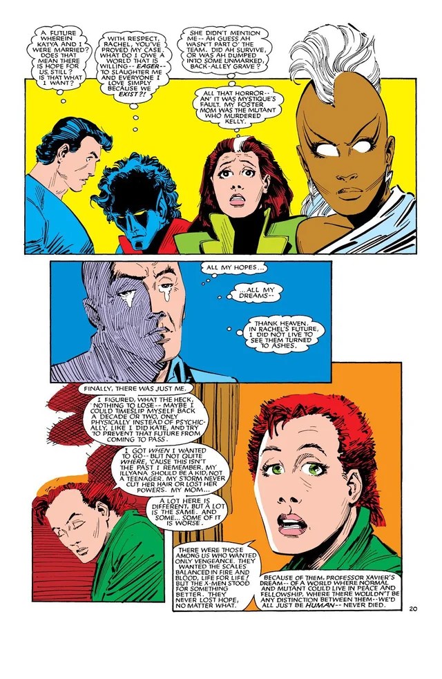 No fim, os X-Men têm uma reunião na Mansão X para discutir a proposta da Lei de Registro Mutante, mas a conversa termina interrompida pela necessidade de apresentação de Rachel Summers aos demais, quando ela conta sua origem e sua suspeita de que o seu futuro não é vinculado ao nosso presente. Mas saber dos eventos do futuro tem um grande impacto no time e Xavier vai às lágrimas ao ver que tudo pelo o qual lutou foi em vão. Em consequência dos aspectos complexos relacionados à origem da garota, os X-Men decidem não contar nada disso a Ciclope.