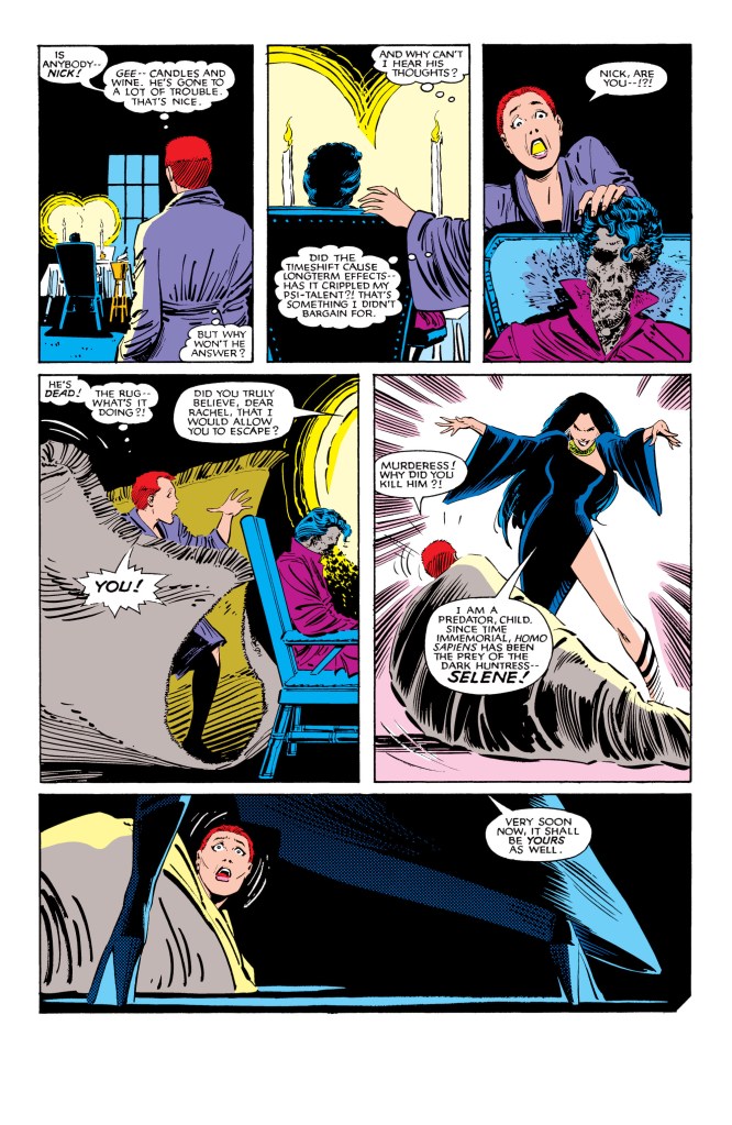Outro elemento daquela edição era a chegada de Rachel Summers, a filha de Scott e Jean Grey vinda do futuro de Dias de um Futuro Esquecido, que chegou ao nosso tempo presente em New Mutants 18, do mês anterior. Na trama, em vista dos X-Men serem todos mortos pelos Sentinelas, a versão adulta de Kitty Pryde lançou mão de uma “programação telepática” que fez com que Rachel fosse lançada ao nosso presente. Mas ela começa a estranhar que o nosso mundo não parece com o passado dela e começa a suspeitar que veio parar em outra linha temporal que não a sua! Afinal, Tempestade é totalmente diferente (pelo visual) e sua mãe está morta! Ela encontra o time após ser salva do ataque de Selene, que é um tipo de vampira que suga a energia vital das pessoas, mas desmaia ao perceber que está no tempo errado…