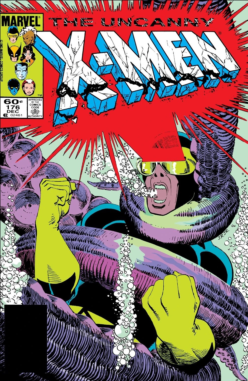 Scott Summers e Madelyne Pryor partem para sua lua de mel em Uncanny X-Men 176, de dezembro de 1983, e como não poderia deixar de ser, se metem em encrenca: o avião em que voam, pilotado por Madelyne, tem uma pane e eles pousam no Pacífico (onde iriam passar um tempo em uma ilha paradisíaca) e são atacados por um polvo gigante… o que se era despropositado (era) pelo menos rendeu uma capa muito legal por John Romita Jr. A edição ainda mostra Logan e Mariko tendo uma conversa para por os pingos nos “is” e ela assume que desistiu do casamento por causa da ação do Mestre Mestal, mas que não pode ficar com ele por causa de ser a herdeira do império criminoso do pai e que, embora deseje se unir a ele, só fará isso quando “limpar” o clã Yashida.