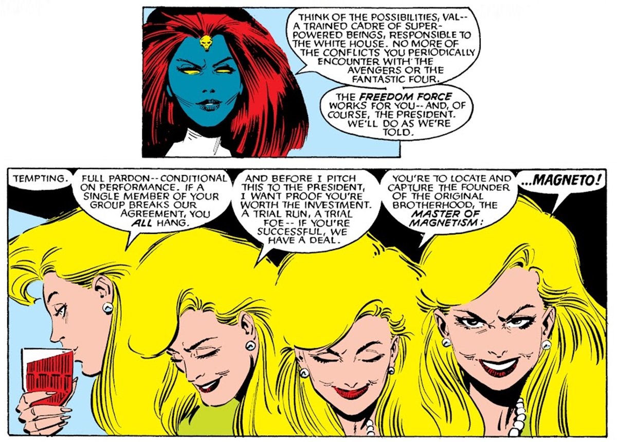 Mística pede proteção do Governo para ela e sua Irmandade de Mutantes e propõe um plano ousado: que eles se transformem na Força Federal, um grupo de mutantes que faria qualquer coisa que o governo quisesse, qualquer missão. Mesmo tomada de surpresa, Val não titubeia e aceita a proposta, indicando como primeiro alvo: Magneto!