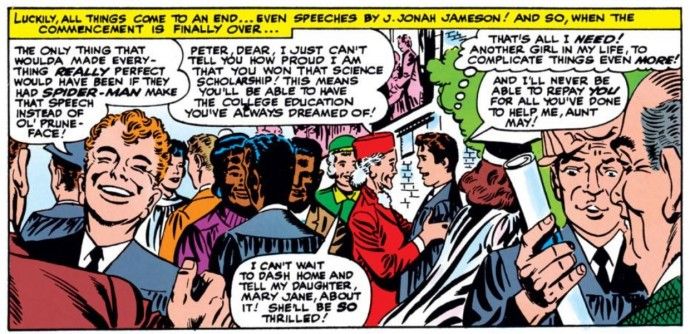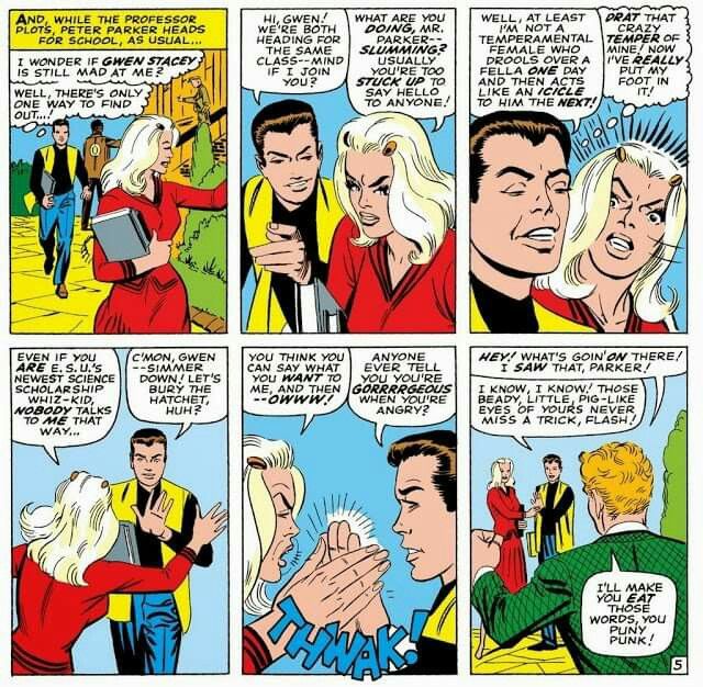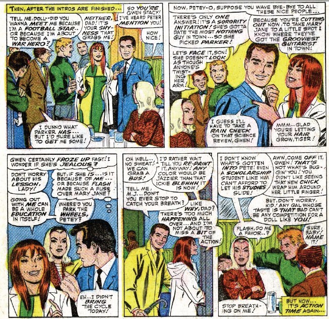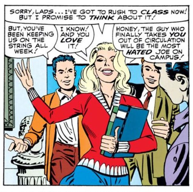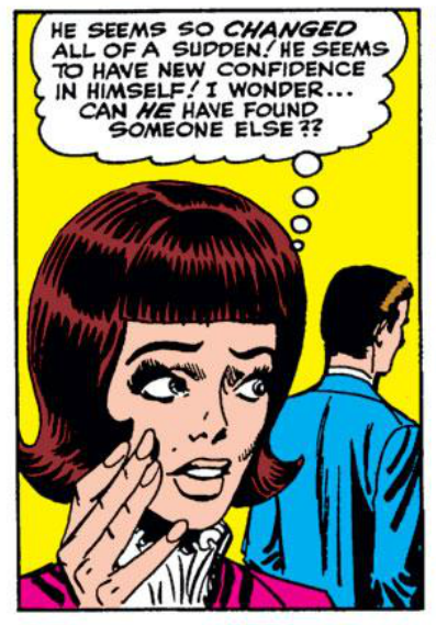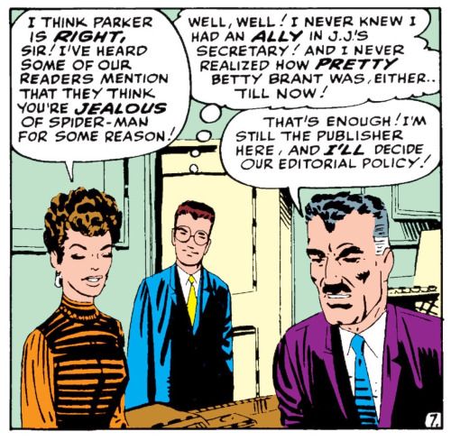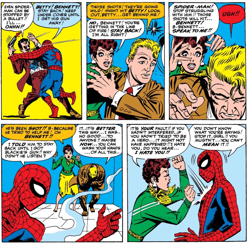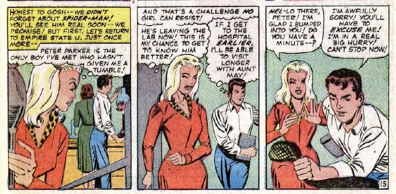 A jogada de fazer a namorada do herói odiar seu salvador foi uma tacada genial (provavelmente de Ditko, que cuidava do direcionamento da revista), porque invertia ao oposto do que normalmente ocorria com os personagens dos quadrinhos a partir do paradigma de Clark Kent e Lois Lane: a mocinha apaixonada pelo herói não dá bola à sua identidade civil. Ao gosto de Lee, sem dúvida, tal movimento trouxe mais drama às histórias, pois agora, davam outro motivo para Peter guardar bem sua identidade secreta. Esse recurso da namorada raivosa com o herói seria imitado na própria revista, no futuro, com Gwen Stacy.