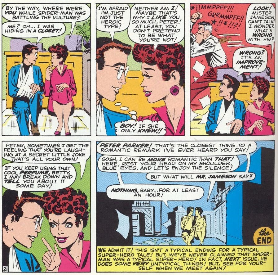 Mas a história termina com o Abutre tentando atacar o Clarim Diário e Betty descobre que tem sentimentos por Peter ao vê-lo em perigo. No fim das contas, Peter e Betty terminam em baixo de uma mesa e vemos um momento de carinho entre os dois, o que pode ser tomado como o início do namoro dos dois (pelo menos pelos padrões dos anos 1960).