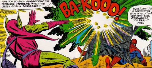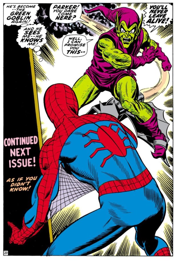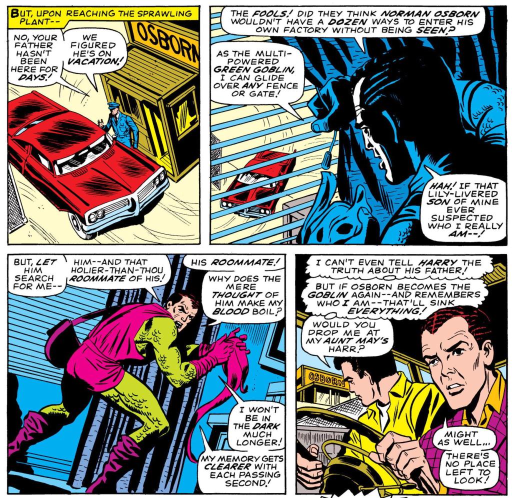 Na trama, Osborn está recuperado da “síncope” que teve anteriormente (o retorno breve do Duende Verde – falamos já sobre isso) e está de novo sem as memórias de seu passado criminoso; porém, para azar de todos, o teatro em que MJ irá se apresentar é um prédio que pertenceu a Norman no passado, e ele reconhece o lugar e a existência de uma base secreta no porão vai lhe fazendo lembrar de tudo. No fim, ele encontra a tal sala e volta a ser o Duende, em outro daqueles belíssimos quadros de página inteira com a arte dinâmica de Gil Kane e o embelezamento discreto de John Romita.