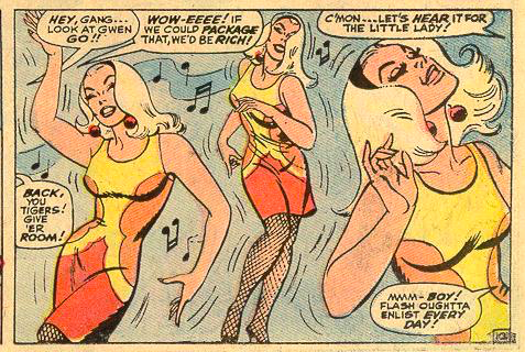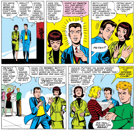 Em paralelo, na trama colegial, Lizz Allan também ganha um novo visual – de novo mais em gosto aos anos 1960 – e continua suas investidas em Peter. A iniciativa não passa despercebida por Betty e Ditko e Lee começam a brincar com o humor em torno do antes azarado Peter agora ser disputado de modo férrico por duas belas mulheres. Nesta ocasião, enquanto Flash Thompson arma a criação de um fã clube do Homem-Aranha, Lizz comenta que Betty ganhou peso e a chama de “senhorita Brant”, trazendo de novo elementos de que a secretária do Clarim era mesmo mais velha do que Peter e sua turma.