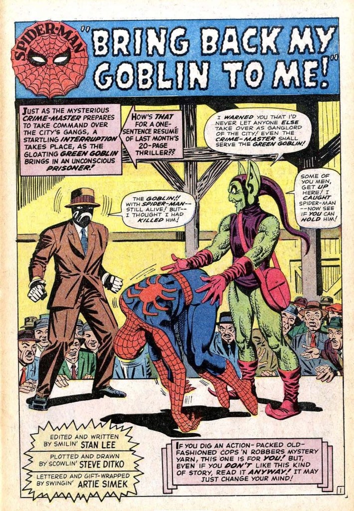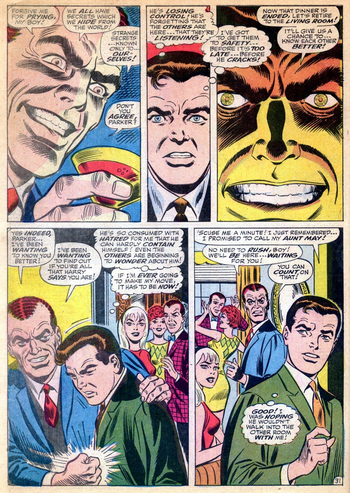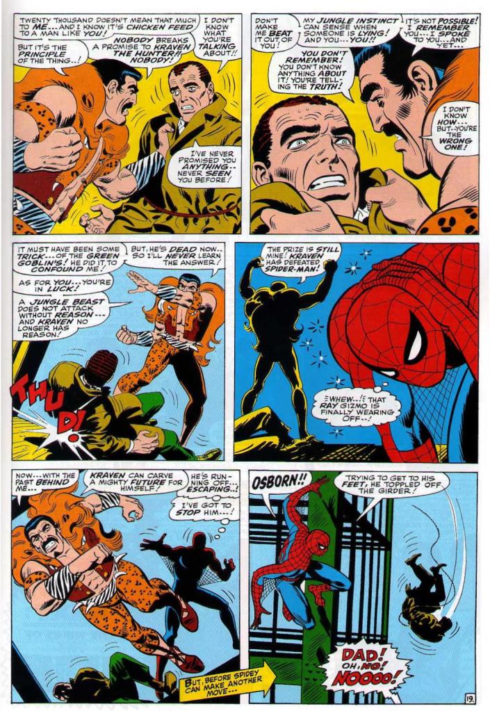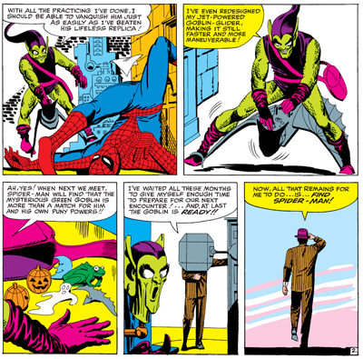A batalha com o Duende Verde é retomada e Lee e Kane mostram de novo como o vilão é astuto: desenvolvendo uma nova bomba que anula o poder de grudar nas paredes do Homem-Aranha. O que se torna pior quando o estoque de teia se acaba. O aracnídeo apenas dá a volta por cima quando novamente obriga ao vilão a ver seu filho, agora, no leito de um hospital. A visão tem um efeito forte em Norman, que termina entrando em colapso e, novamente, esquecendo sua persona do Duende e “voltando ao normal”. Mas apesar da vitória, Peter ainda fica lamuriando a perda de Gwen. Contudo, Stan Lee estava disposto a dar um final feliz (ao menos temporário) ao rapaz: chegando em casa, Peter reencontra Gwen, que voltou da Inglaterra para os seus braços!
