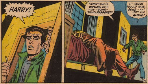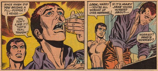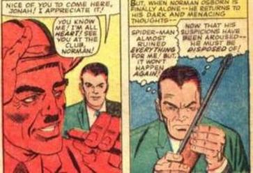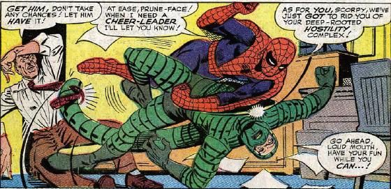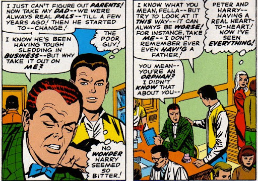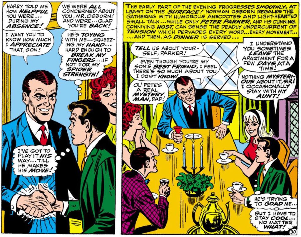 A trama de Lee cria um cenário para isso: Peter e Harry vão à estreia da nova peça de Mary Jane Watson num teatro no Greenwish Village; mas com Gwen longe, MJ, que estava namorando Harry já há um tempo, volta a dar em cima de Peter descaradamente (adiante, a trama justifica que ela fazia isso não apenas por safadeza – bom, talvez, só um pouco – mas porque queria dar um choque de realidade em Harry, que não acompanhava a “animação” dela e vivia para baixo, o que é um adendo interessante), o que enche Harry de ressentimento, o que se soma ao seu comportamento com tendências depressivas, que já é abordado de modo muito direto desde a edição 39 (a primeira de Romita) e aquela conversa primeira dele com Peter.
