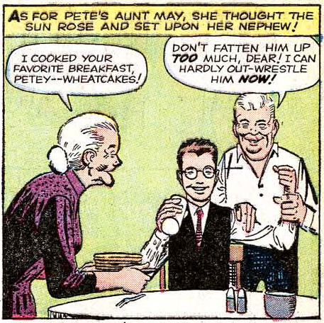 As primeiras histórias justificavam o fato de Peter manter sua identidade secreta por dois motivos: os editorais explosivos de Jameson, que faziam o Homem-Aranha ser tratado como um criminoso; e o fato de sua Tia May sofrer de uma doença cardíaca séria (revelada já em ASM 01) e poderia morrer com o choque da descoberta. Ao mesmo tempo, a pensão deixada por Ben não é o suficiente para mantê-los, o que é agravado pelo caro tratamento (e remédios) de May. Então, Peter precisa desesperadamente de um trabalho de meio-período que não o atrapalhe na escola. Então, tem a “brilhante” ideia de fotografar a si mesmo (ou seja, o Aranha) quando vê um anúncio no Clarim Diário oferecendo dinheiro por imagens exclusivas da “ameaça mascarada”, como vemos em Amazing 04.