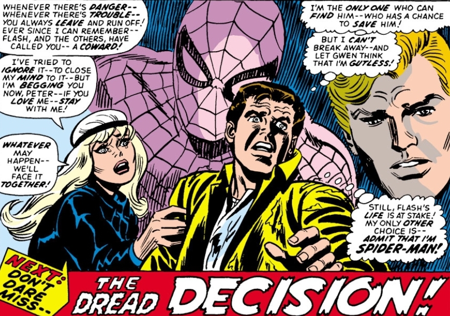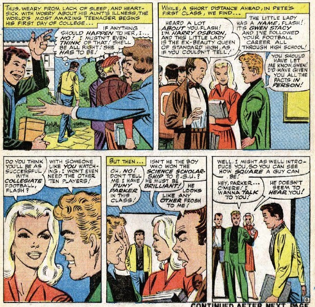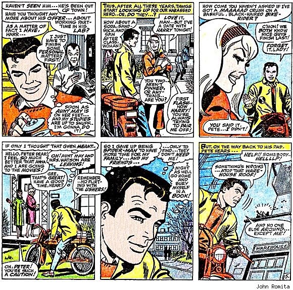 Stan Lee dedicava certo espaço para o desenvolvimento da vida pessoal de seus personagens (como o Homem de Ferro ou Thor), mas nada era parecido com o que acontecia com o Homem-Aranha, que tinha sua vida civil explorada em detalhes e de modo profundo nas revistas, o que provavelmente era algo que divertia bastante Ditko e devia lhe lembrar de seu passado ilustrando revistas de romance. Isso era totalmente distinto do que a concorrente DC Comics fazia, nas quais a vida pessoal de seu heróis eram apenas “notas de rodapé” nas histórias e mesmo suas namoradas estavam muito mais envolvidas com os heróis mascarados do que suas identidades secretas.
