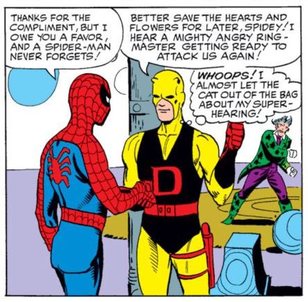 Essa história dá início à longa vinculação que haverá entre o amigão da vizinhança e o homem sem medo, da qual falaremos algumas vezes neste Dossiê. Outro ponto é que, por causa de seus poderes. Murdock percebe que o Homem-Aranha deve ter apenas uns 17 anos de idade.