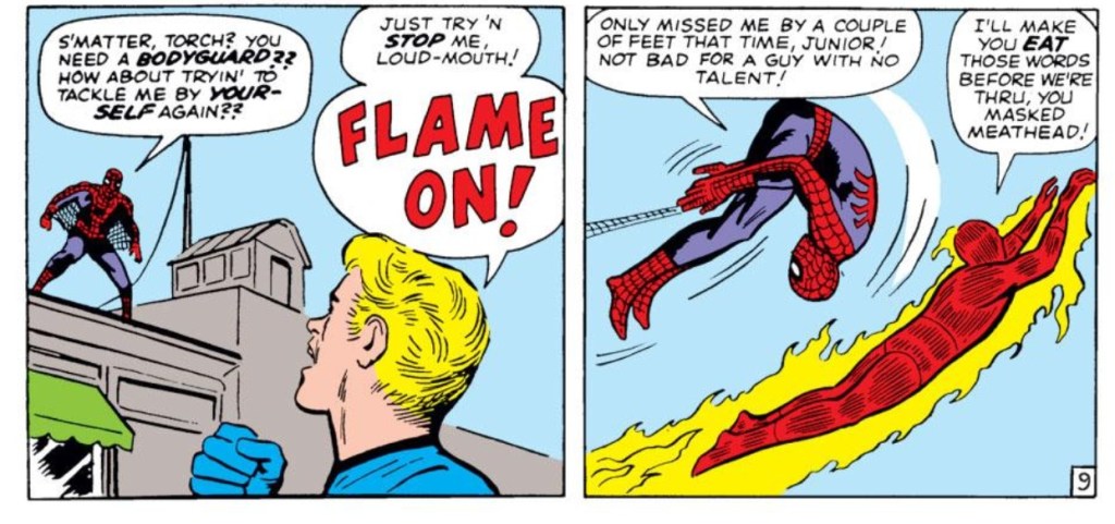 Contudo, em meio à luta, alguém liga à procura de Peter para informar que a Tia May sofreu um ataque cardíaco. O escalador de paredes ouve o recado e, sem pensar, sai correndo em busca de sua tia, deixando o Tocha Humana sozinho para lutar contra o Duende, que não tem interesse nisso e vai embora. O público fica pensando que o Aranha “amarelou” e fugiu.