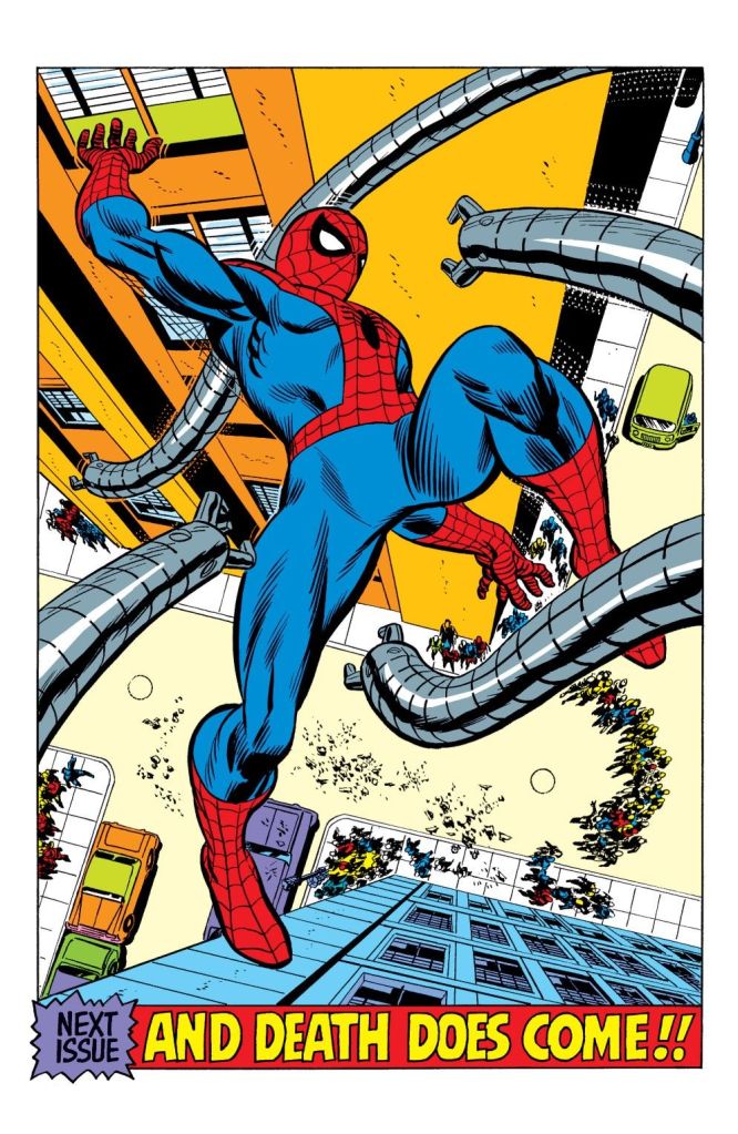 Depois de se recuperar, Peter vai pra casa e trabalha numa teia modificada que possa afetar os tentáculos do vilão e parte para uma nova ronda, encontrando o sinal do rastreador, mas é uma armadilha: Octopus esperava por ele. Uma nova batalha se dá nos telhados (com a polícia e transeuntes acompanhando o evento), mas ao usar a nova teia, Otto realmente perde o controle dos tentáculos que saem se movendo sem controle e destroem um chaminé de alvenaria que cai para a rua. O Aranha percebe que há uma criança no caminho, mas está longe demais. Então, no último instante, George Stacy se lança para salvá-la e é atingido pelos destroços.