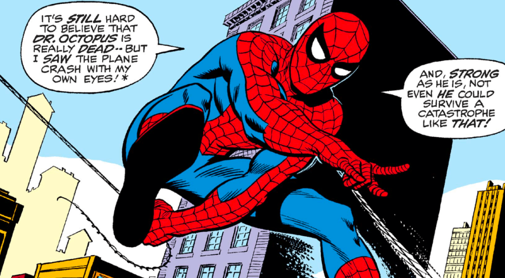 Octopus então simplesmente lança o corpo inerte do herói para a morte certa por uma queda a dezenas de metros de altura. Gil Kane realmente mostrou a que veio nessa edição, criando quadros compostos com várias figuras do herói para demonstrar as idas e vindas de sua busca, trazendo angulações novas e terminando com um arrebatador quadro do escalador de paredes caindo para a morte numa página inteira.