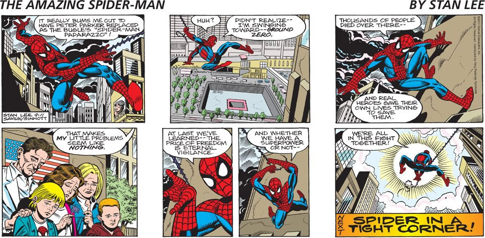 Stan Lee é um velhinho bastante ativo. Aos 88 anos, continua lançando personagens novos, estrelando programas de TV, atuando como consultor nos filmes baseados nos heróis da Marvel Comics, fazendo “pontas” na maioria deles etc. Além disso, há mais de 20 anos, escreve uma tira de jornal do Homem-Aranha, publicada em diversos periódicos dos Estados Unidos. Esta semana, o autor aproveitou a lembrança dos 10 anos dos atentados de 11 de setembro e colocou o escalador de paredes refletindo sobre o que aconteceu. Veja abaixo.