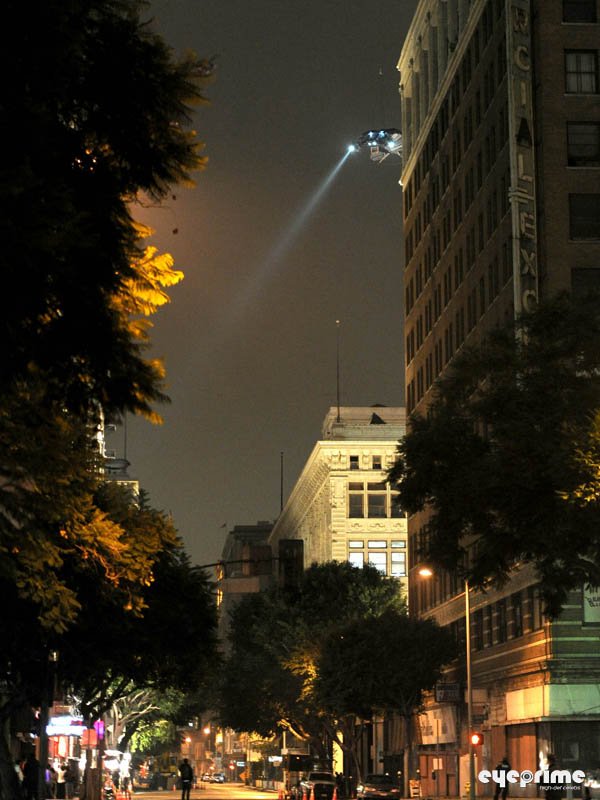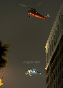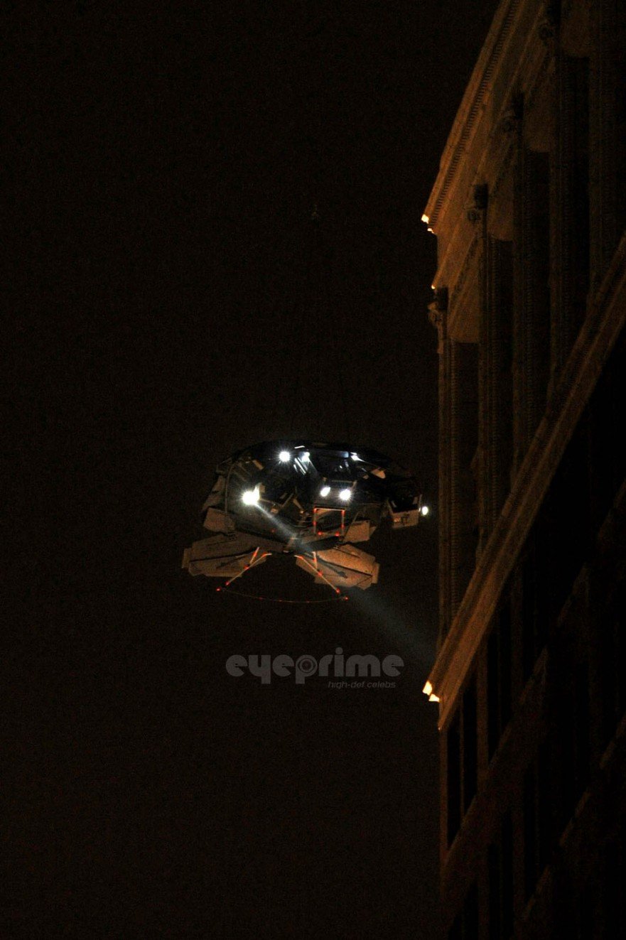 Vale destacar apenas que, alguns dias atrás, fãs flagraram uma ousada cena com o batwing, a nave do Batman, sobrevoando literalmente os prédios de Los Angeles. O veículo já tinha sido usado das mais diversas formas, com um guindaste, em cima de um caminhão adaptado – para “voar” próximo ao solo – , puxado por cabos e passando por entre os prédios e em cima das viaturas da polícia etc. Mas agora, ele foi içado por um helicóptero por meio de um longo cabo de aço e posto literalmente acima dos prédios da cidade, o que envolve uma logística e um risco enormes (e se ele se chocasse contra um edifício ou caísse do cabo?).