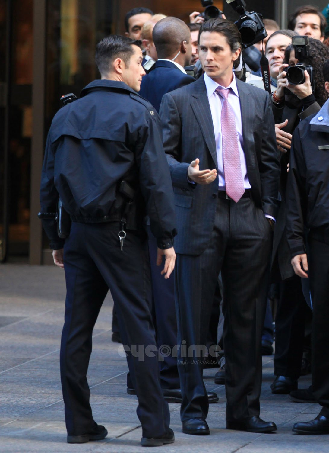 Esta cena parece ser uma sequência (anterior ou posterior) a outra já registrada em Los Angeles na qual os dois foram registrados juntos, inclusive dentro de uma viatura. O que será que o Sr. Wayne aprontou para necessitar de proteção policial?