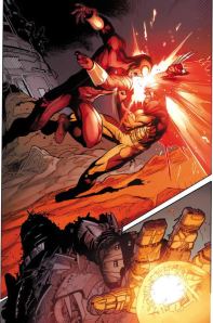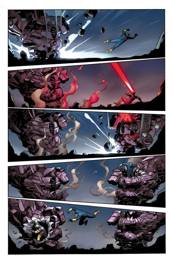 Há pouco tempo, todos os X-Men e boa parte dos mutantes, inclusive Ciclope e Wolverine, estavam em Mutopia, mas houve o cisma e uma grande briga entre os dois ex-amigos, intermediada, ainda, por um Sentinela, aqueles robôs gigantes que caçam mutantes. Veja cenas da briga abaixo (clique nas imagens para ampliá-las) extraídas da minissérie Schism, escrita por Jason Aaron e desenhada por Andy Kubert (caso das páginas abaixos) e outros desenhistas: