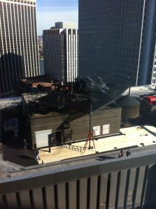 Ainda em Nova Jersey, as cenas gravadas na Prefeitura envolvem um cenário confuso, que parece um abrigo de sem-tetos adaptado dentro do prédio, mas ao mesmo tempo, tem pessoas armadas. Também estão presentes o Comissário Gordon (Gary Oldman), atuando como uma espécie de líder, Lucius Fox (Morgan Freeman) e Miranda Tate (Marion Cotillard). Pelo que dá a entender, eles estão sitiados ali, provavelmente pela (contra a) Liga das Sombras.