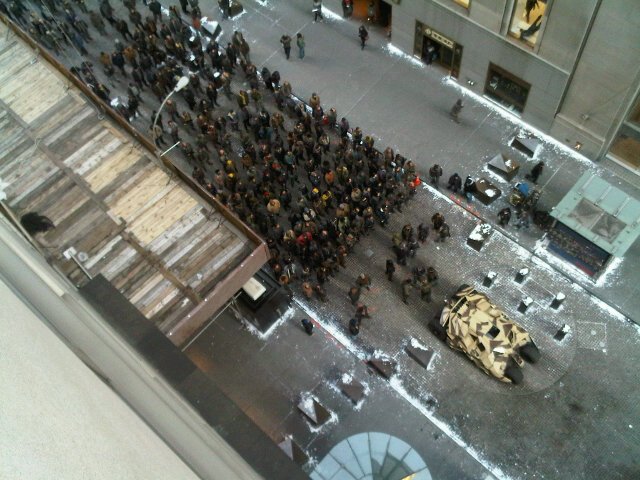 A produção de Batman – O Cavaleiro das Trevas Ressurge, o último capítulo da trilogia do homem-morcego comandada por Christopher Nolan, continua suas gravações na cidade de Nova York este final de semana. A “grande maçã” “dublará” parte da fictícia cidade de Gotham City. Já se sabia que ontem (04 de novembro) seria gravada uma grande cena de conflito em massa em plena região de Wall Street, o principal distrito financeiro da cidade (e do mundo). E de fato ocorreu! De frente para prédios como o Trump Bulding – que no filme será a Wayne Enterprises – quase mil figurantes saem correndo em dois blocos opostos, uns contra os outros, um representando as forças policiais da cidade de um lado e outro com os mercenários da Liga das Sombras.