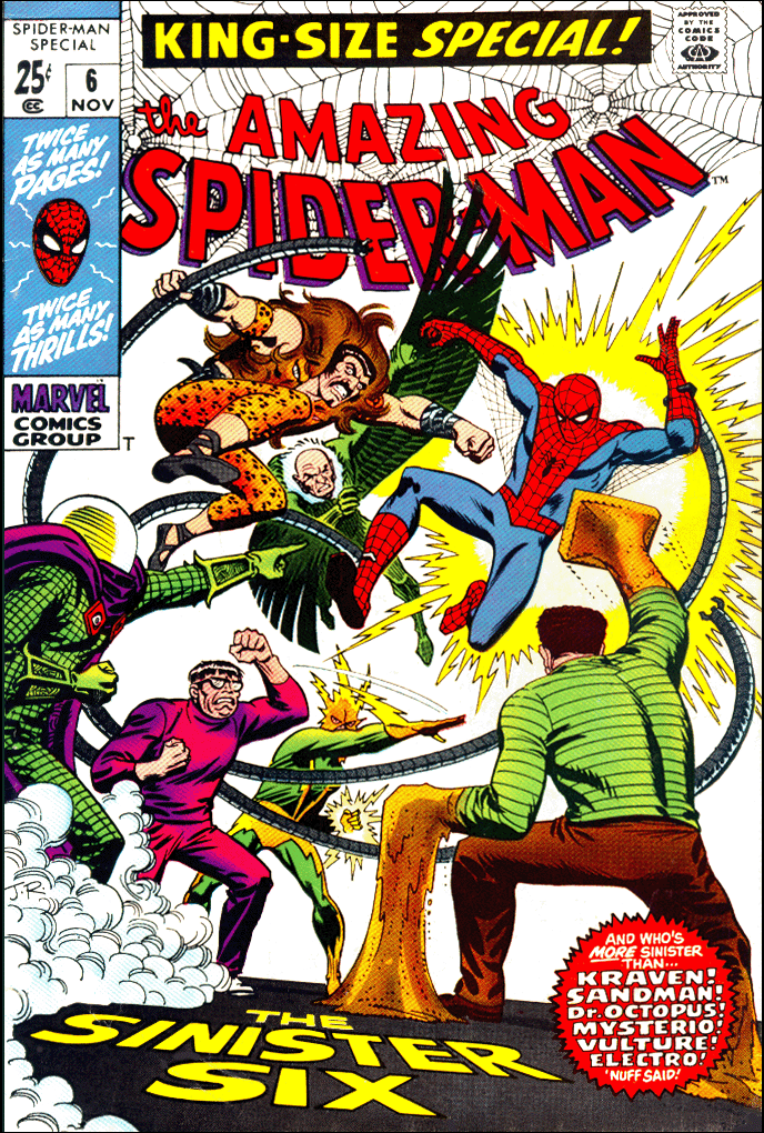O Sexteto Sinistro também foi criado por Lee e Ditko e estreou em Amazing Spider-Man Annual 01 de 1965, com a reunião de alguns dos principais vilões do personagem na época: Dr. Octopus, Abutre, Elektro, Mysterio, Homem-Areia e Kraven, o Caçador. Apesar de um ótima ideia, não foi retomada por Stan Lee ao longo de sua longeva temporada no personagem, que se findou apenas em 1972.