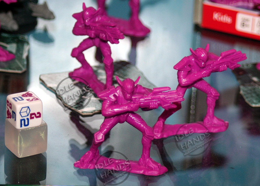 Há muitos suspeitos – novamente, clique no link acima – mas hoje o blog Idle Hand publicou imagens de um jogo de tabuleiro com figuras dos Vingadores que trazem aliens muito parecidos com o que vemos nas imagens do trailer. Porém,enquanto no filme eles são azuis, no jogo são inteiramente roxos.