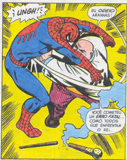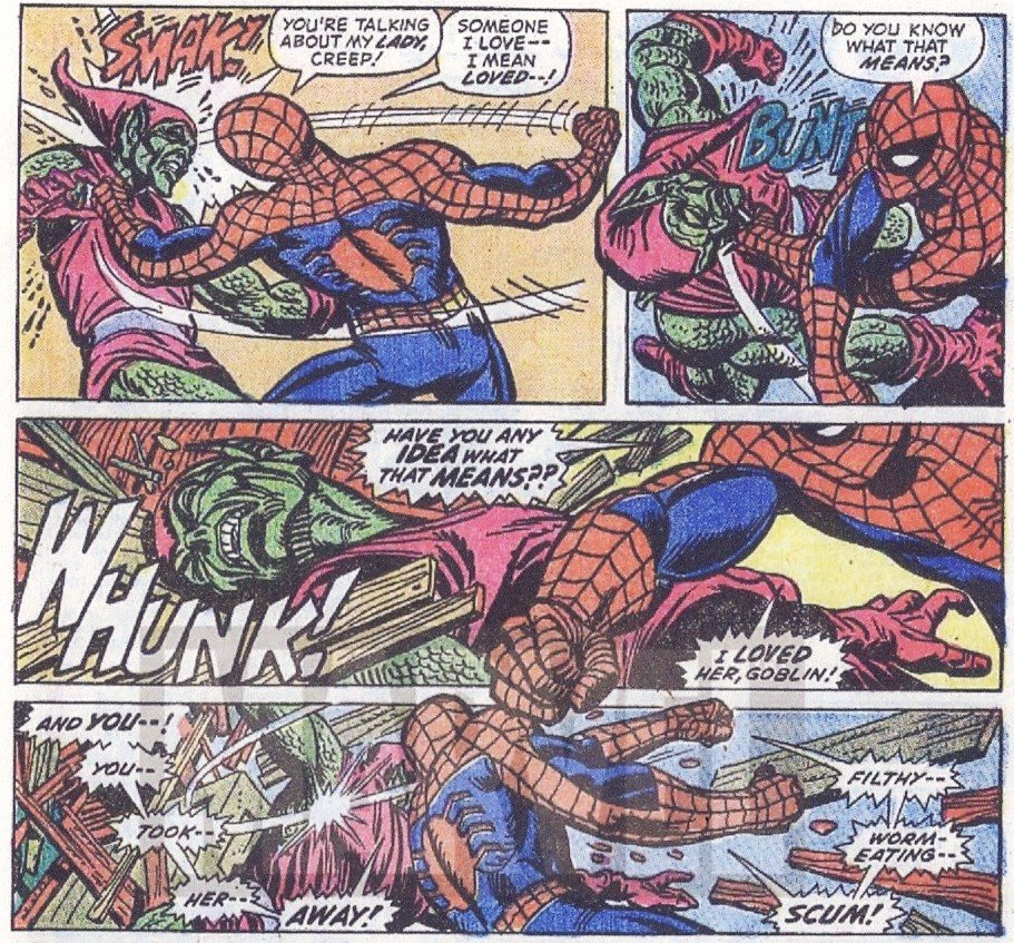 E não fica nisso: um enfurecido Aranha sai em busca de vingança contra o Duende Verde e temos uma batalha esganiçada entre os dois que resulta também na morte de Norman Osborn (por sua própria culpa: caiu na armadilha que armou com seu próprio jato). De novo, uma morte brutal e explícita.