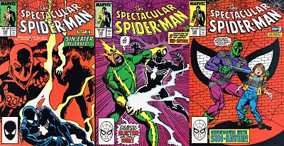 Web of Spider-Man 31 e 32; Peter Parker: The Spectacular Spider-Man 131 e 132; e Amazing Spider-Man 293 e 294, 1987, por J.M. DeMatteis e Mike Zeck.