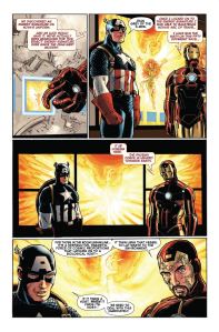 Capitão América e Homem de Ferro explicam o tamanho do problema ao Governo: texto de Brian Bendis e arte de John Romita Jr.