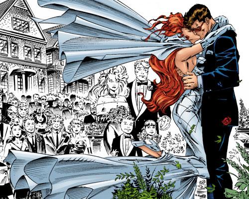 O casamento de Jean Grey e Scott Summers. Arte de Andy Kubert.