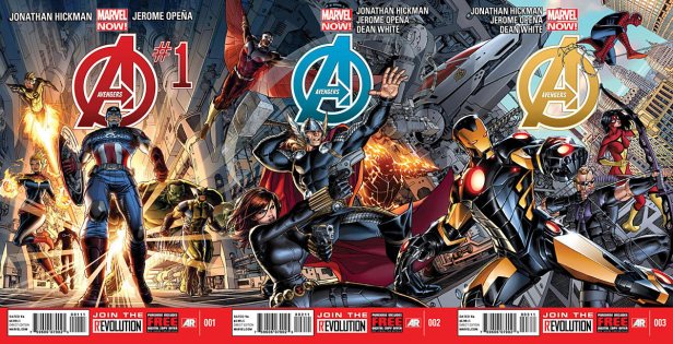 Por fim, em outra notícia relacionada aos Vingadores, a editora divulgou um poster que reúne as três primeiras edições da nova revista The Avengers, com roteiros de Jonathan Hickman e desenhos de Jerome Opeña, dentro do evento Marvel Now, que se inicia em outubro. A editora revelou ontem que a nova equipe dos Vingadores terá nada menos do que 18 membros! Como consequência dos eventos de Avengers Vs. X-Men (maxissérie que vem sendo publicada desde o fim do ano passado, escrita por Brian Michael Bendis e desenhada por John Romita Jr.), a nova equipe terá membros do universo mutanteda Marvel.