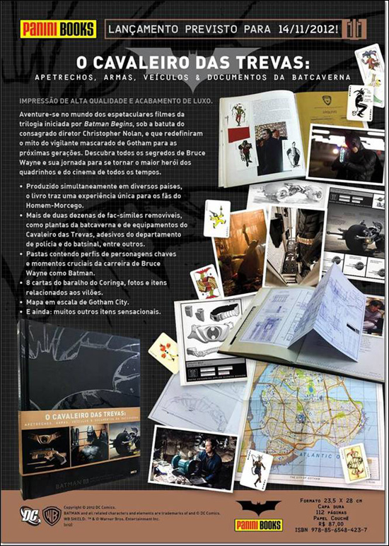 Acompanhando o lançamento de Batman – O Cavaleiro das Trevas Ressurge, o último capítulo da trilogia comandada por Christopher Nolan sobre o homem-morcego publicado pela DC Comics e levado ao cinema pela Warner Bros., foram publicados nos EUA vários livros técnicos sobre os filmes. Agora, um deles chega ao Brasil: o fantástico O Cavaleiro das Trevas: Apetrechos, Armas, Veículos e Documentos da Batcaverna.