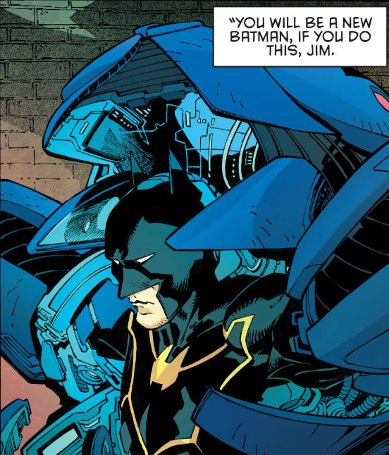 Na verdade, é uma armadura em estilo mangá e, claro, não é Bruce Wayne quem está embaixo dela. Não chega a ser um grande spoiler, o novo Batman é o Comissário James Gordon.