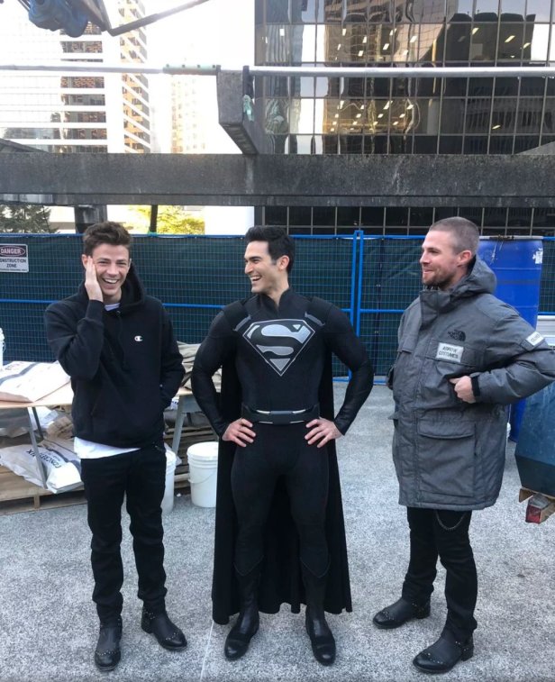 Pegando todo mundo de surpresa, o ator Stephen Amell, o protagonista da série Arrow, divulgou no Twitter uma imagem dos bastidores do crossover que irá reunir as tramas daquela com The Flash e Supergirl, e a imagem mostra o Superman com um uniforme preto!