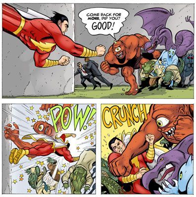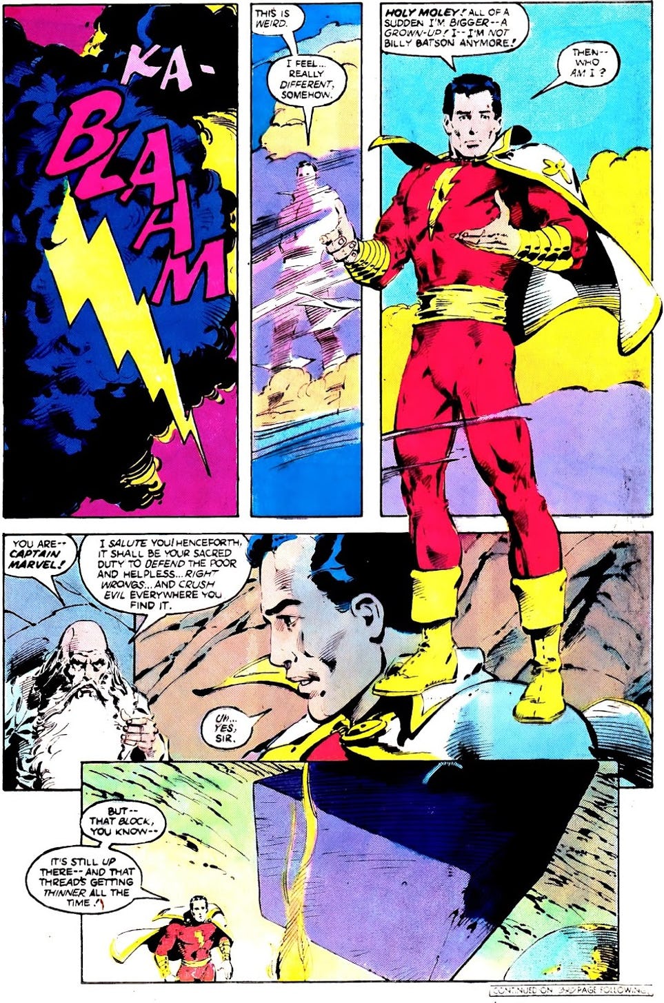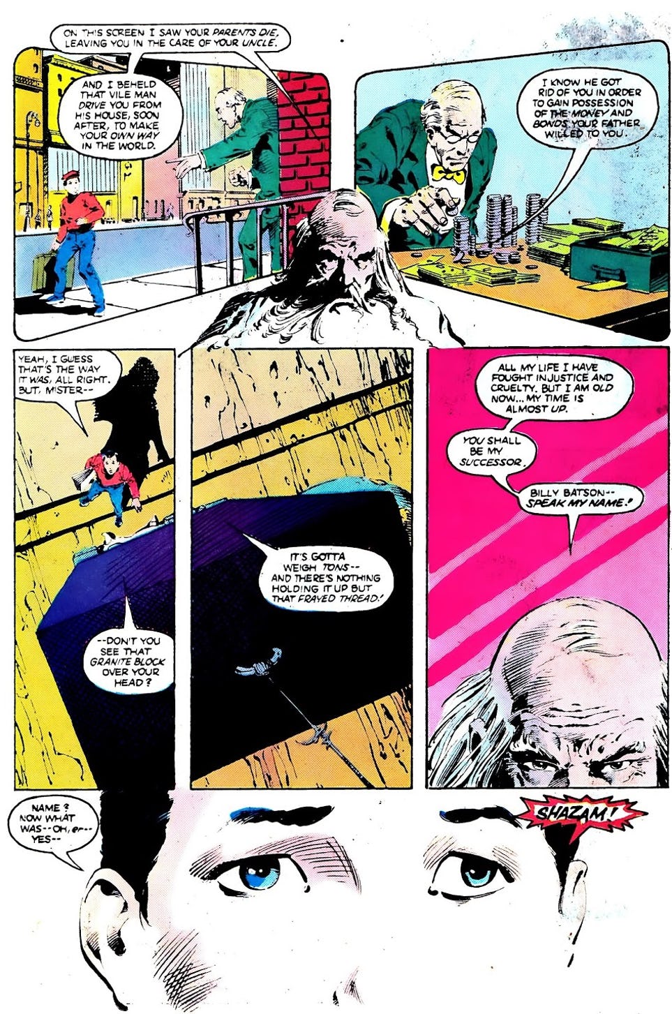 A trama é uma bela releitura da origem clássica da Fawcett, apenas modernizando alguns conceitos e excluindo toda a Família Marvel, respondendo à tendência da DC de “enxugar” o universo de seus personagens, tal qual fizera com sucesso com o Superman – que foi desprovido de Supergirl, Superboy, Kripto o supercão e todas essas coisas.