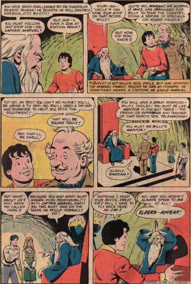 Então, num golpe de sorte, a WHIZ TV onde Billy Batson trabalha o designa para cobrir o evento em um motorhome exatamente como na série. Billy vai ao encontro do Mago Shazam que lhe presenteia com um dispositivo (idêntico ao da série) com a qual pode conversar com ele e os Antigos à distância. E o Tio Dudley – o Tio Marvel – convenientemente passa a ostentar um bigode para deixá-lo parecido com o Mentor da TV e o Mago diz que ele será o Mentor de Billy em sua nova aventura.