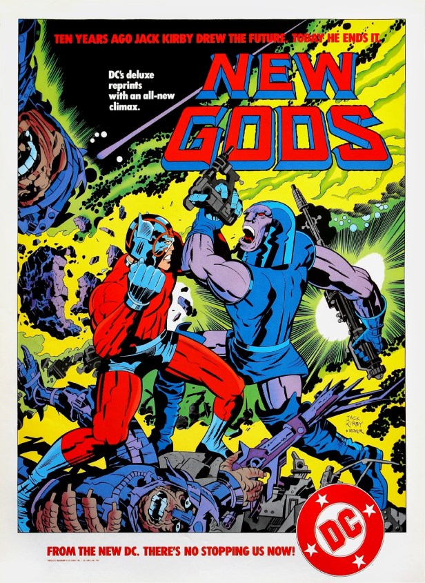 Ao sair da Marvel em 1970, Kirby foi para a DC Comics e criou Os Novos Deuses, uma trama épica, mitológica e cósmica que começa com o Ragnarok (a morte dos velhos deuses) e o nascimento de uma nova leva de seres celestiais, na qual dois planetas, Nova Gênesis e Apokolips, travam uma batalha eterna. Contra o vilão Darkseid, emergem heróis como Orion, Senhor Milagre e a Grande Barda.