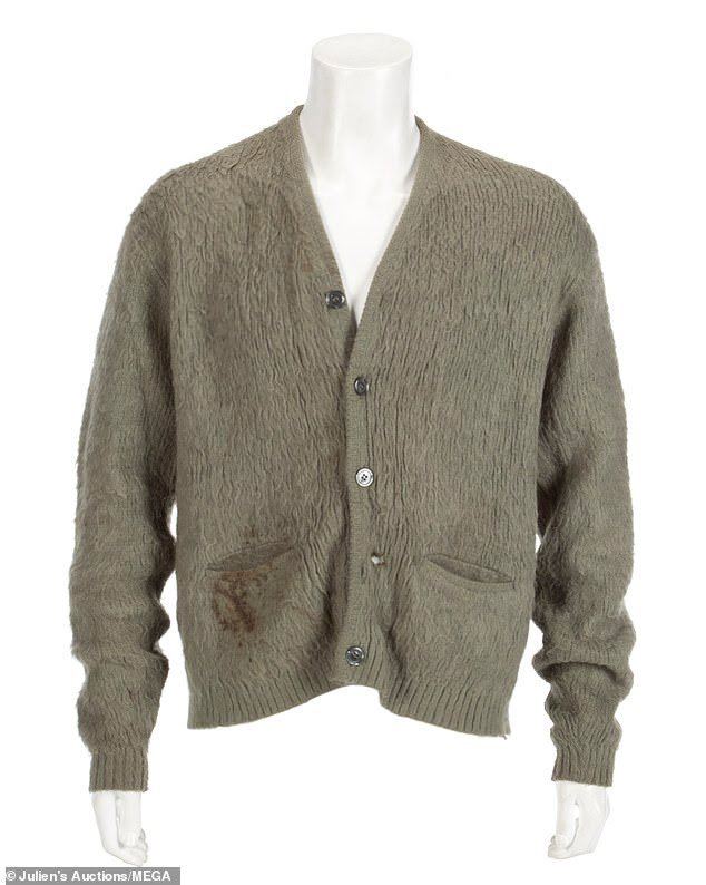 O cardigã verde oliva de Cobain, que tem um buraco causado por cigarro no bolso direito e foi o casaco do tipo mais caro já vendido.