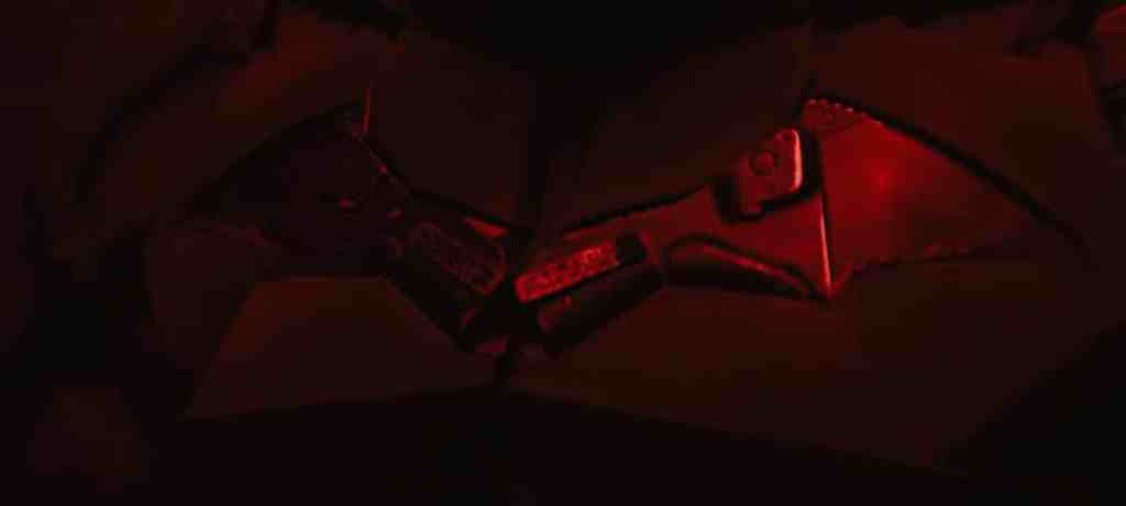 O batsímbolo é incorporado como algo prático, como se fosse uma dobradura da armadura que casualmente forma algo parecido com um morcego. A roupa tem mesmo elementos que lembram os desenhos de Lee Bermejo, que faz uma batroupa mais “funcional”. Podemos ver uma gola na roupa (algo que nenhum outro Batman do cinema teve), ombreiras e o peitoral, enquanto o abdômen parece mais tradicional. O capuz é esguio e segue a linha do rosto do ator com a abertura dos olhos em destaque. Não parece haver uma lente nos olhos, como circularam rumores, mas a abertura dos olhos tem uma saliência.